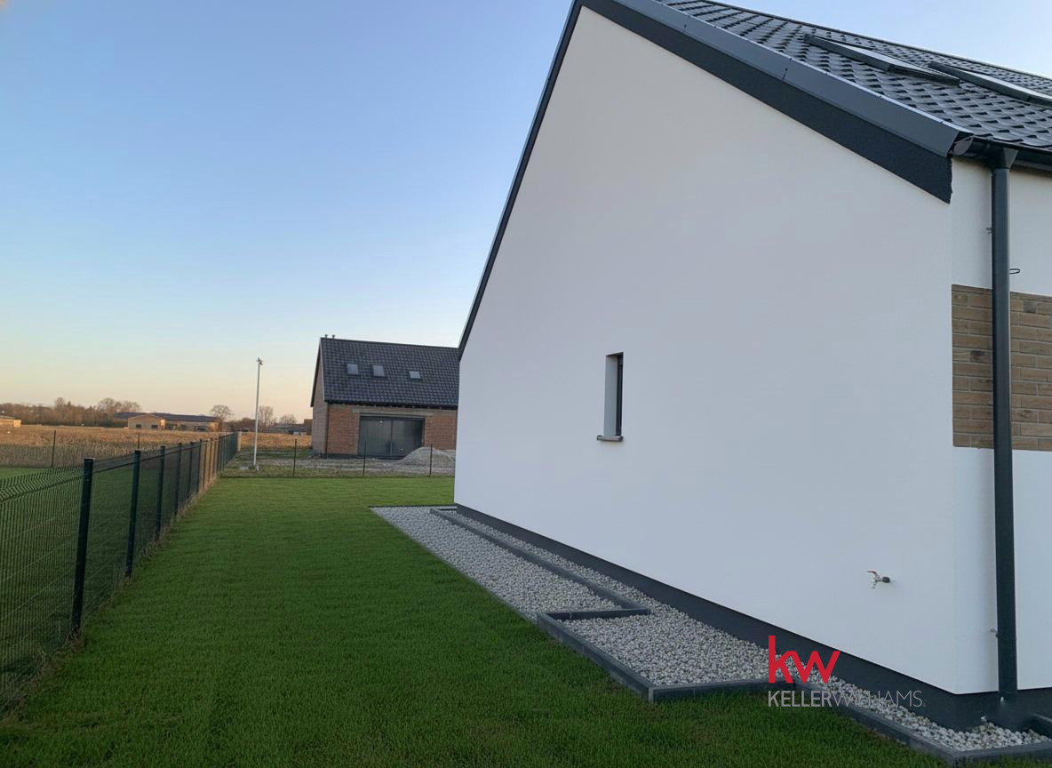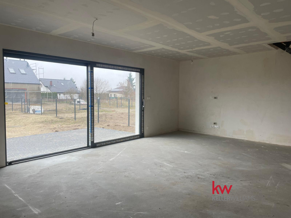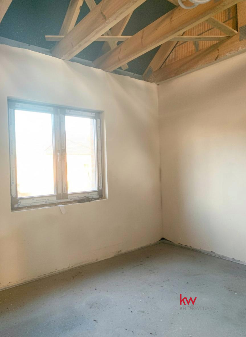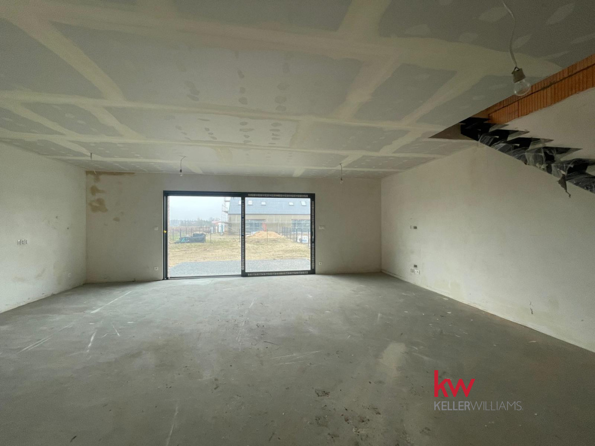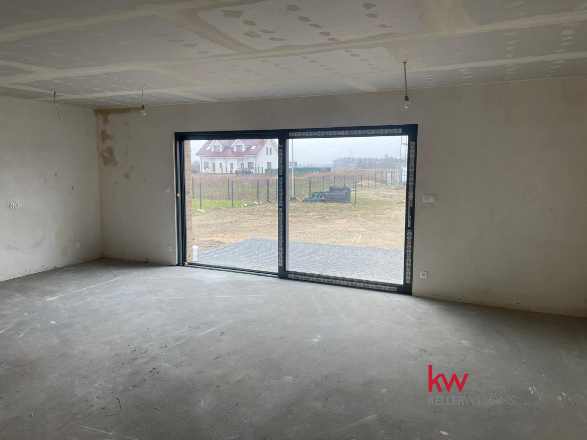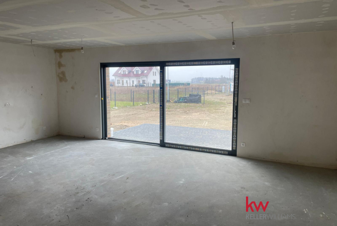 Specyfikacja: Ogrzewanie podłogowe, pompa ciepła, elektryczne rolety, okna trzyszybowe, duże przesuwne okno tarasowe HST, szambo, opłotowanie z 3 stron, podjazd z kruszywa i wybrukowany taras.