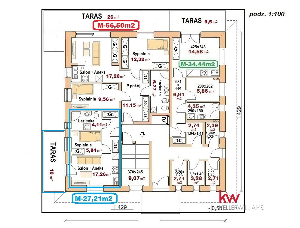 1. Salonu z aneksem kuchennym o powierzchni 17,46mkw;