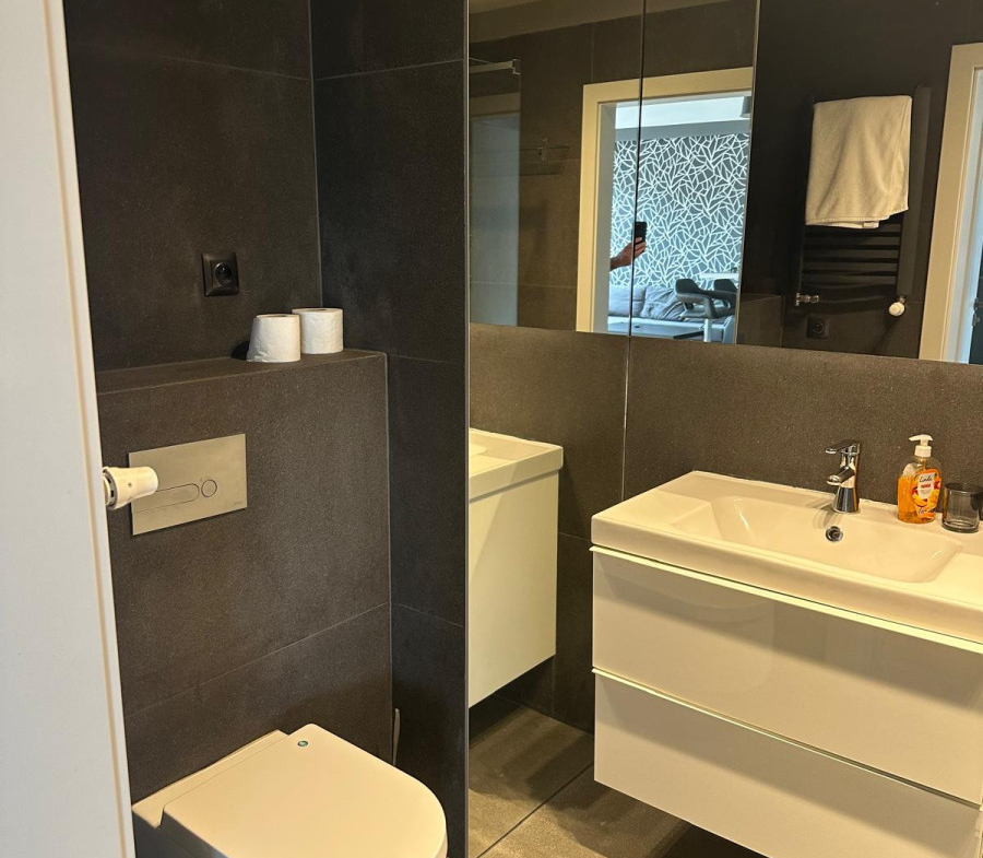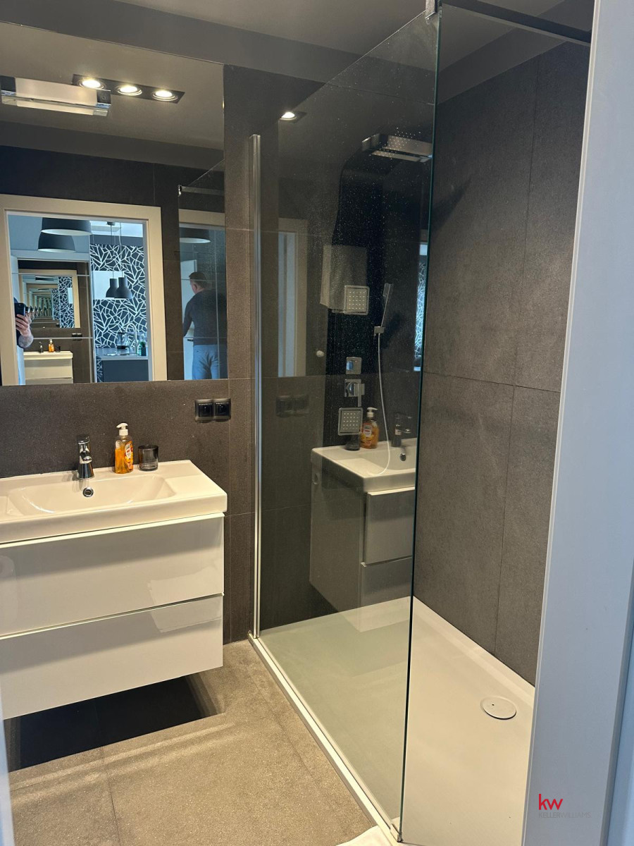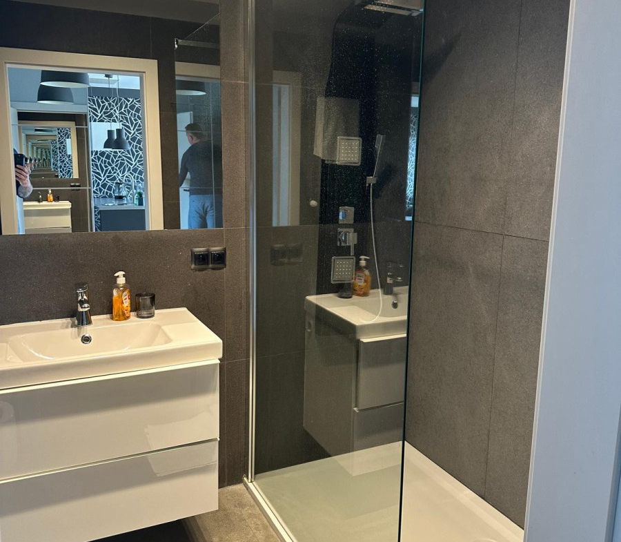- Łazienka – wykończona w eleganckim, ponadczasowym stylu.