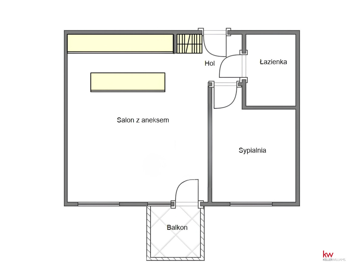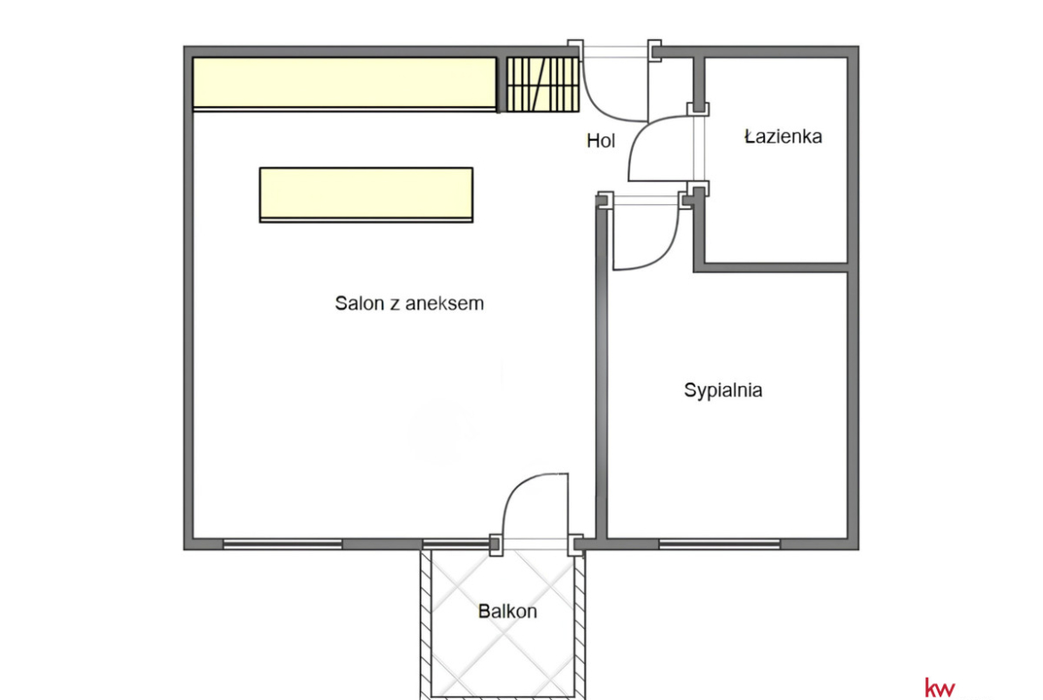 - Przestronny salon z aneksem kuchennym – miejsce do przyjmowania gości i codziennego odpoczynku, z bezpośrednim wyjściem na balkon.