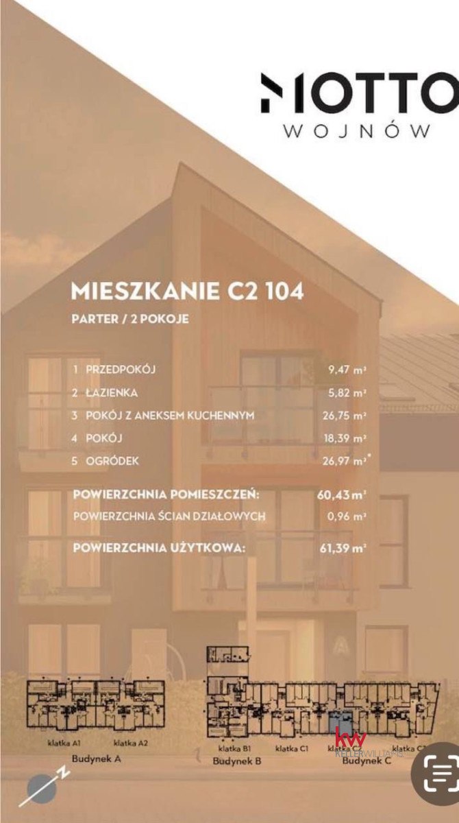 Na sprzedaż wyjątkowe mieszkanie 2-pokojowe o powierzchni 60,43 m², położone na parterze nowoczesnego budynku w kameralnym, zamykanym osiedlu MOTTO Wojnów.