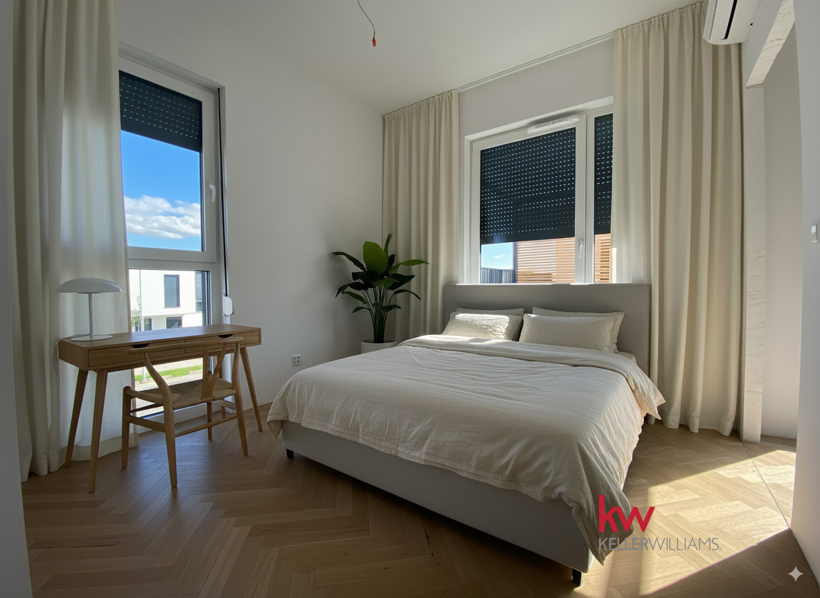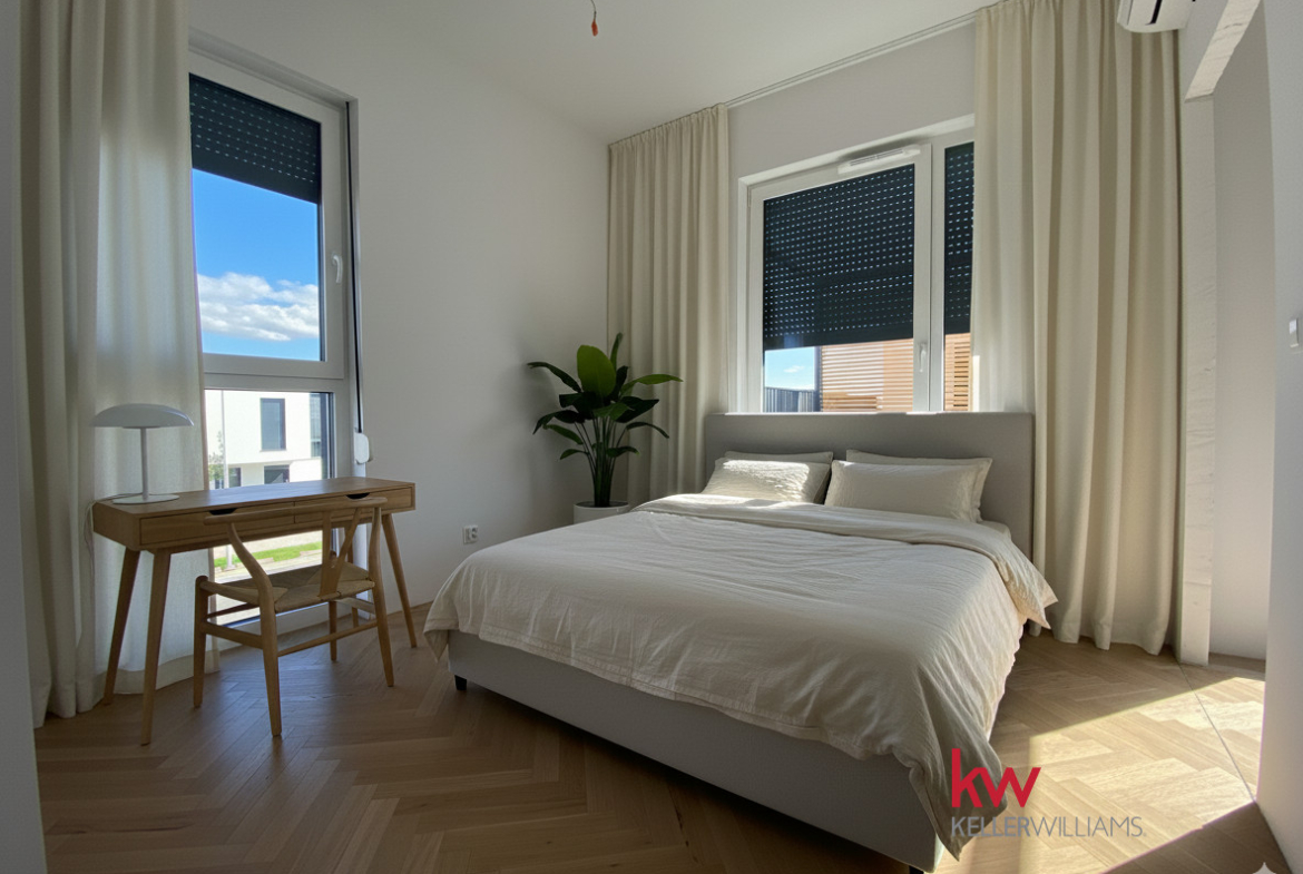 Nowoczesny skrajny segment na Krzykach we Wrocławiu. Kameralne osiedle*, prywatny ogród, taras i inteligentny system Smart House. Idealna propozycja dla rodzin z dziećmi i osób pracujących zdalnie – bezpieczna przestrzeń, nowoczesny design i wygoda życia blisko miasta, a jednocześnie z dala od zgiełku. W okolicy to jedna z lepszych propozycji, osobne wejście, niska zabudowa, wysoki standard wykończenia. Dom skrajny z ogrodem i tarasem od strony południowej, w okolicy tylko niska zabudowa. Bardzo funkcjonalne rozwiązania: