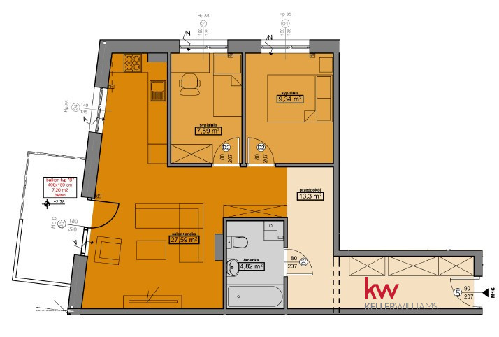 • Salon z aneksem kuchennym (27,59 m²) – przestronne centrum mieszkania, idealne do wspólnego spędzania czasu. Otwarta strefa dzienna z nowocześnie wyposażoną kuchnią.