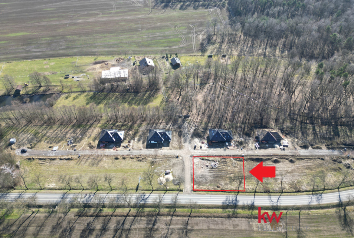 Oferta obejmuje zakup działki wraz z gotowym projektem domu oraz podłączonymi mediami i udziałem w drodze dojazdowej.
