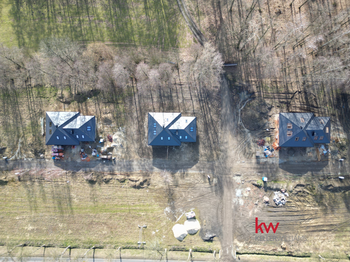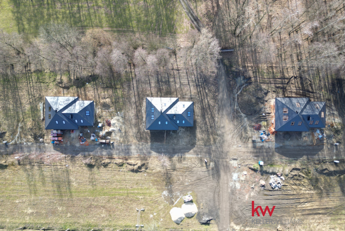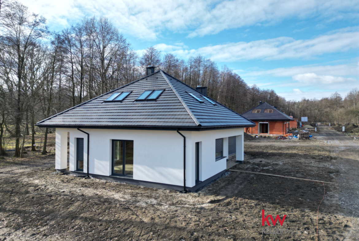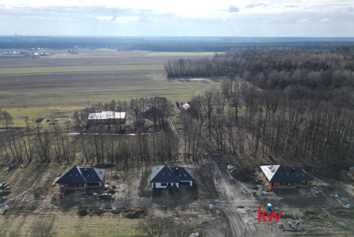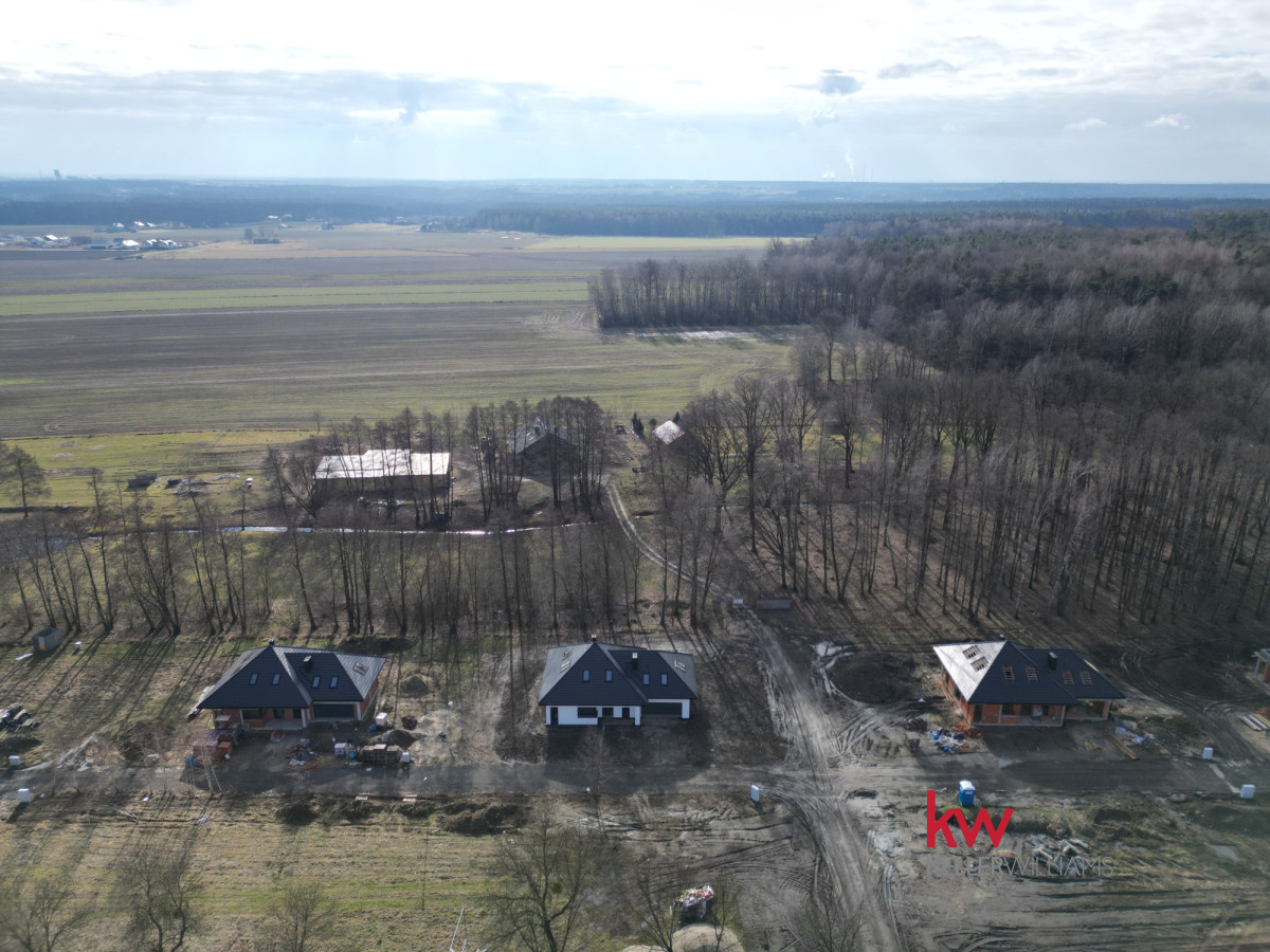 * Dom stoi wśród drzew, w sąsiedztwie kilku innych budowanych domów jednorodzinnych. * * * Idealne miejsce dla każdego, kto chce mieszkać poza miastem i jednocześnie blisko niego, gdzie cisza idą w parze z wygodą codziennego życia.